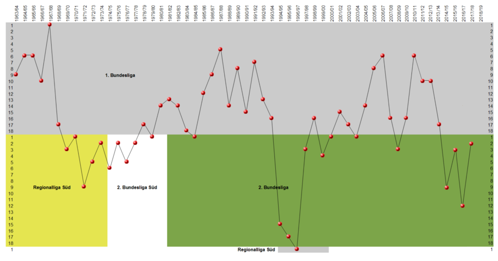 Obecne lata nie są jednak zbyt obfite w sukcesy, a klubowi jest przypinana łatka… windy. To właśnie do niej porównuje się Nürnberg, ponieważ tak jak ona niemiecka drużyna zmienia często swój poziom. Najlepiej jej stabilność, a właściwie to brak, przedstawia poniższa grafika. Zawiera ona lokaty tego zespołu na koniec każdej kampanii od wspomnianego już przeze mnie momentu powstania nowej ligi.
