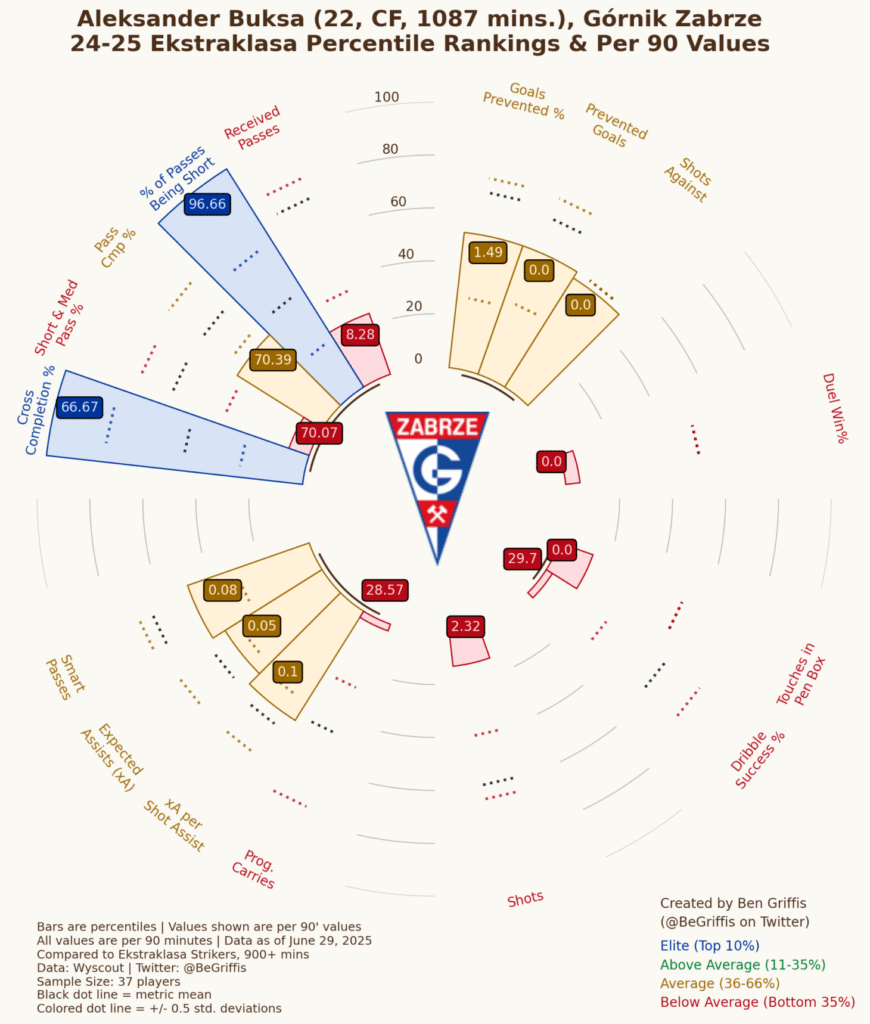 Aleksander Buksa to 22-letni napastnik, który mierzy 189 centymetrów. Jego głównym atutem jest z pewnością wzrost, który zawsze potrafił eksponować. W ostatnim sezonie było bardzo mało aspektów, które by go wyróżniały. Często tracił piłkę, znikał i był niewidoczny. Można powiedzieć, że jedyny powód, który sprawiał, że grał w barwach Górnika, to status młodzieżowca. Warto w tym miejscu dodać, że w młodzieżowych drużynach Wisły grał jako środkowy pomocnik ofensywny ze względu na swoje słabe warunki fizyczne. Wielu kibiców w Zabrzu narzekało na jego zaangażowanie w mecz i to, że nie potrafi zagrać ciałem oraz przepchnąć słabszych fizycznie od siebie zawodników. Zwracał na to uwagę również Jan Urban. Można rzec, że jest to napastnik trochę bezjajeczny.