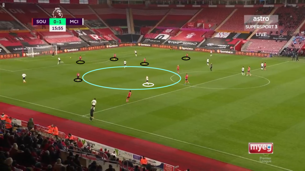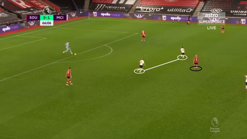 A jak Pep Guardiola podszedł do sobotniej konfrontacji w obronie? Przede wszystkim skupił się na odcięciu dwójki środkowych pomocników Southampton, którzy od początku sezonu spisują się znakomicie. Hiszpan chciał wyłączyć z gry Jamesa Warda-Prowsa, który w głównej mierze odpowiada za rozprowadzanie piłki w boczne sektory boiska. Zarówno Anglik, jak i Oriol Romeu zostali jednak zneutralizowani przez dwóch zawodników City. W pierwszej połowie za sprawą duetu Kevin De Bruyne–Ferran Torres, a w drugiej Kevin De Bruyne–Bernanrdo Silva. Wymienieni zawodnicy byli ustawieni jako dwójka napastników i dzięki małym odległościom miedzy nimi piłka swobodnie nie mogła trafiać do rozgrywających gospodarzy.