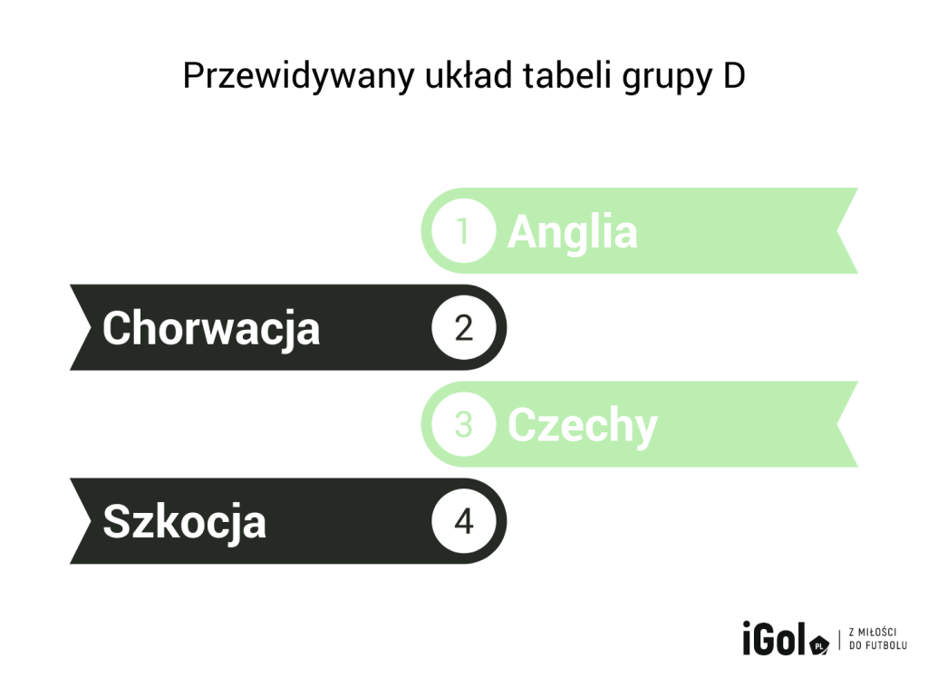 Najsłabszym zespołem wydaje się Szkocja. Jak powiedział Robin Bainer, w drużynie panuje pewien entuzjazm. Ja jednak kierowałbym się ku stwierdzeniu, że Szkocja jest najsłabszą ekipą w grupie, wypadającą mocno przeciętnie na tle Czechów oraz Chorwacji, o Anglikach nie wspominając. Z tego też powodu typowałbym reprezentację Steve’a Clarke’a na ostatnim miejscu.