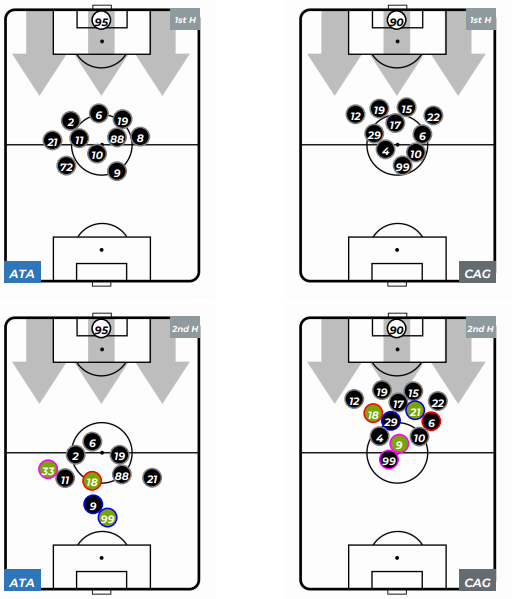 Gra opierająca się na pressingu i ataku ma również parę wad. Wspomniana linia defensywy jest ustawiana bardzo wysoo, żeby jak najszybciej przejąć futbolówkę i samemu rozpocząć akcję. Wahadłowi asekurują boczne strefy boiska i błyskawicznie pomagają w ataku. Jednak momentami nawet na taką grę można znaleźć receptę. W 11. kolejce Serie A Atalanta przegrała u siebie z Cagliari 0:2. Linia obrony gospodarzy była ustawiona wyżej od rywali. Po przerwie ta różnica jeszcze się powiększyła. Wtedy klub z Bergamo przegrywał 0:1 po samobójczym trafieniu Mario Pasalicia. W dodatku gospodarze grali w osłabieniu po czerwonej kartce dla Ilicicia. Po lewej widzimy ustawienie Atalanty w porównaniu z taktyką Cagliari.