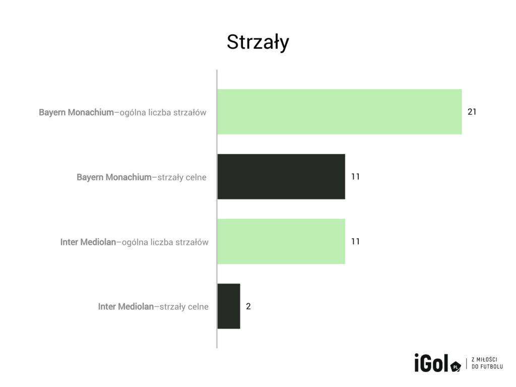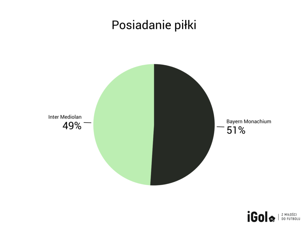 Inter miewał przebłyski dynamicznej wymiany piłki pod polem karnym, ale zabrakło przy tym ostatniego kluczowego podania i okazji do strzału. „Nerazzuri” koncentrowali się głównie na dośrodkowaniach i stałych fragmentach gry. D’Ambrosio i Çalhanoğlu regularnie dośrodkowywali piłkę w pole karne. Niepokojąca była postawa wahadłowych, Gosensa i Dumfriesa, którzy byli nieaktywni w ofensywie. Natomiast po stronie Bayernu Alphonso Davies czynnie włączał się do ataku z lewej strony boiska.