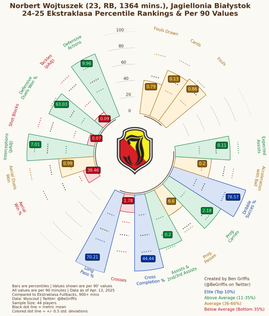 Norbert Wojtuszek w obecnym sezonie notuje średnio 63% udanych pojedynków defensywnych. Jego świetne ustawianie się, dynamika, szybkość oraz motoryka sprawiają, że przeciwnikom bardzo trudno gra się na 23-latka. Dobitnie pokazał to mecz z Realem Betis Balompie, w którym ani na krok nie zostawiał Jesusa Rodrigueza. Można wręcz pokusić się o stwierdzenie, że wręcz go „zajechał”. Kolejnymi ważnymi statystykami jak na prawego obrońcę są dane ofensywne, które przedstawia powyższy radar. Jagiellonia Białystok ma w swoich szeregach człowieka, który uwielbia grę ofensywną. Udowadniał to nie tylko w spotkaniu z Realem Betis, lecz także z Lechem Poznań. Wielokrotnie jego charakterystyka boiskowa wpisuje się w realia nowoczesnego bocznego obrońcy.