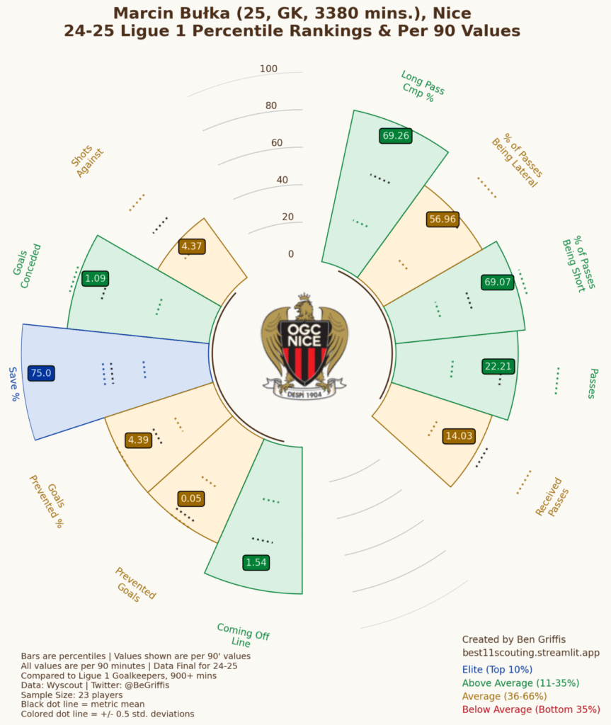 Wystarczy spojrzeć na jego liczby z zeszłego sezonu w Nicei, żeby zrozumieć, dlaczego Bułka jest w cenie. Na wykresie widać, że świetnie bronił – 75% obronionych strzałów to wynik w topie Ligue 1. Wyróżniał się też w grze na przedpolu – 1,54 skutecznych wyjść na 90 minut stawia go w czołówce ligi. Dodatkowo ma solidną jakość w dłuższych podaniach – blisko 70% celności przy próbach rozegrania piłki na dalszą odległość to wynik powyżej średniej.