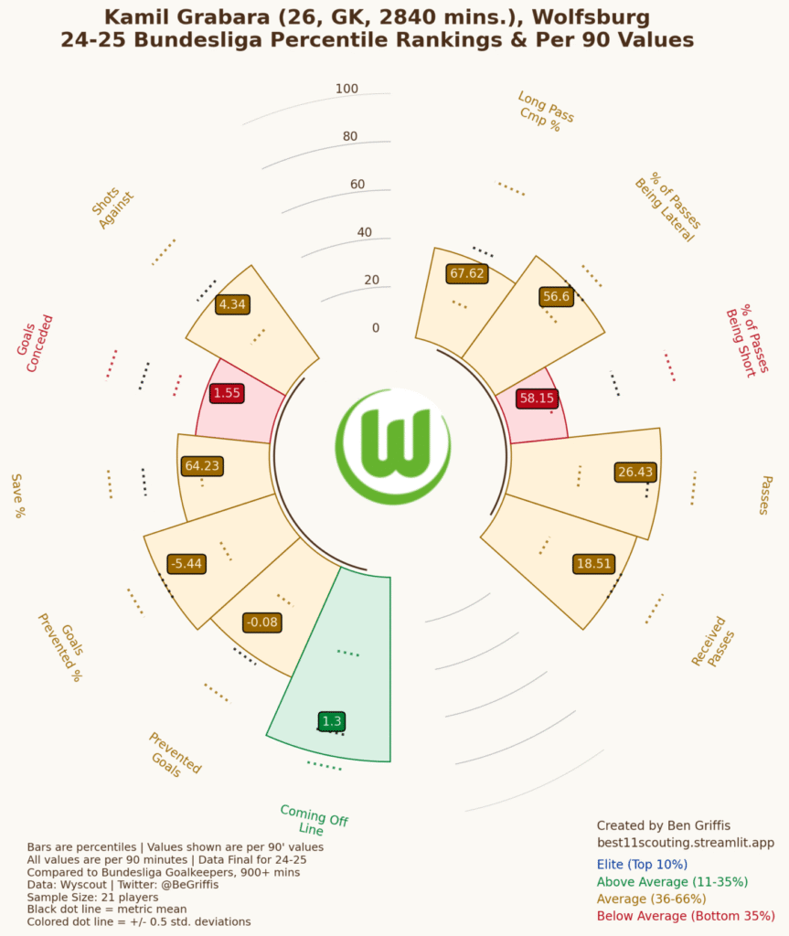 Po pierwsze – Wolfsburg nie był drużyną idealnie zorganizowaną w obronie i często wystawiał swojego bramkarza na trudne sytuacje. Po drugie – Grabara wciąż wyróżnia się w elementach, które są dziś w cenie: potrafi grać nogami, a ponad 67% celnych długich podań to wynik naprawdę solidny. Do tego aktywnie pracuje na przedpolu, notując średnio 1,3 skutecznych wyjść poza linię pola karnego na mecz.