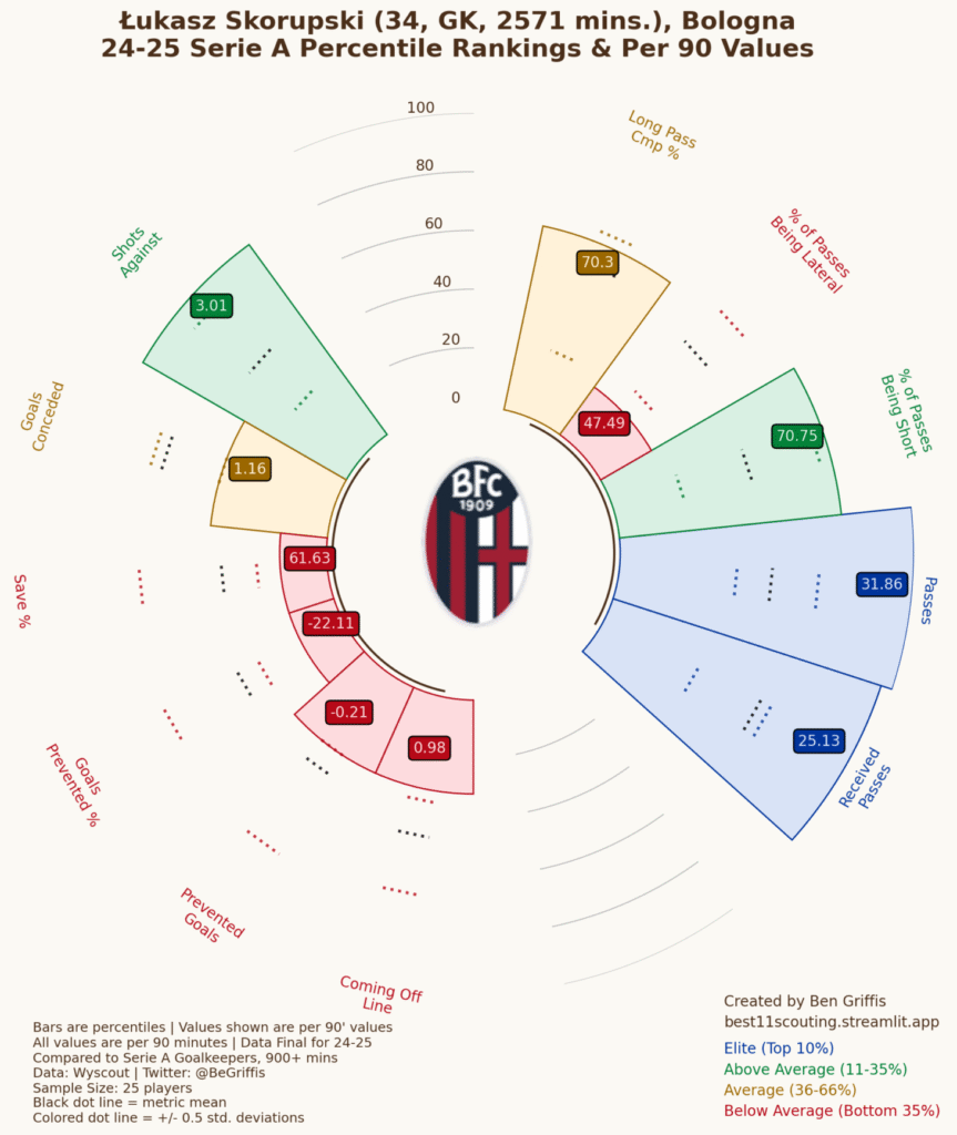 Patrząc na jego liczby z ostatniego sezonu w Serie A, widać kilka rzeczy. Bronił 61% strzałów, co nie jest wynikiem szczególnie mocnym, i w statystyce zapobieganych goli był wyraźnie na minusie – praktycznie 22% poniżej oczekiwań. To pokazuje, że wpadało mu więcej niż powinno. Z drugiej strony statystyki podaniowe wyglądają nieźle. 70% celności krótkich podań i ponad 70% udanych długich zagrań to wartości solidne. Do tego był mocno włączony w rozegranie – średnio ponad 30 podań na mecz, a to dla bramkarza sporo. Mniej aktywny na przedpolu niż Bułka czy Grabara, ale za to dobrze wpisywał się w styl włoskiej drużyny, która bardziej bazuje na ustawieniu defensywy niż na „sweeper keeperze”.
