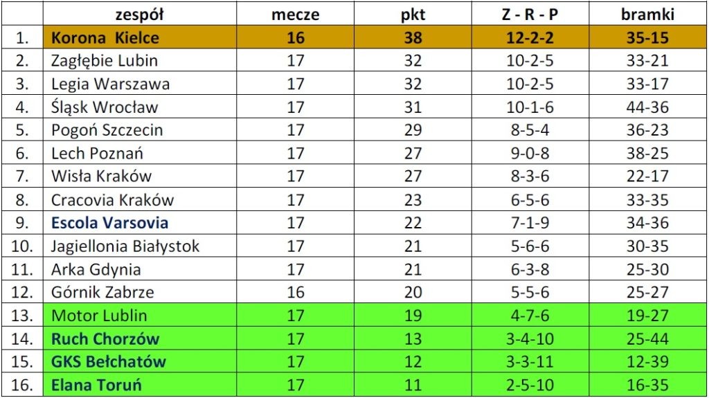 Gorzej natomiast wygląda sytuacja beniaminków (tabela kolor granatowy), spośród których najlepiej radzi sobie warszawska Escola Varsovia. Warszawiacy mają trzy punkty przewagi nad strefą spadkową. Pozostała trójka zamyka ligową tabelę z dużą stratą do pozycji gwarantującej utrzymanie. Trzeba jednak dodać, że są to młodzieżowe drużyny zespołów grających w II lidze.