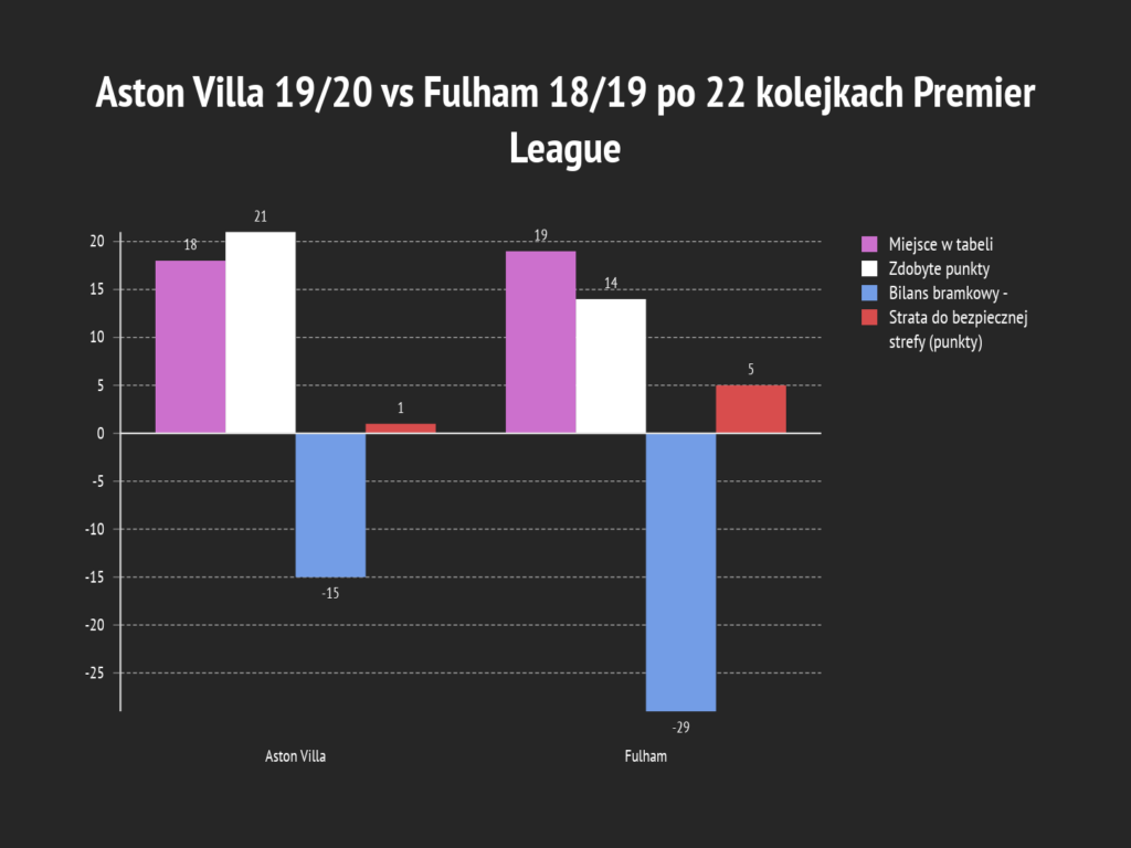Aston Villa wydała w letnim okienku transferowym ponad 100 milionów euro na transfery. Klub z Villa Park mimo tak ogromnej sumy przeznaczonej na wzmocnienia nie jest w stanie złapać optymalnej formy. „The Villans” zajmują aktualnie 18. miejsce w tabeli. Do końca kampanii została jeszcze jednak wystarczająca liczba spotkań, aby uniknąć losu Fulham sprzed sezonu. „The Cottagers” wydali podobną sumę na wzmocnienia co Aston Villa, mimo to nie udało im się utrzymać w najwyższej klasie rozgrywkowej. Na ten moment strata piłkarzy Deana Smitha do bezpiecznej strefy wynosi raptem punkt. Warto także podkreślić, że jego zespół spisuje się punktowo lepiej niż Fulham po 22 rozegranych meczach rok temu.