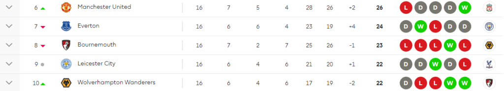 Ostatnie lata na Goodison Park to stabilny byt w gronie najlepszych (7. i 8. lokata), jednak w tej chwili nie można z czystym sumieniem stwierdzić, że ta pozytywna tendencja zostanie podtrzymana. Na tle wyżej wymienionych ekip Everton nie bryluje i widać to m.in. w bezpośrednich starciach. Jedynie z niedawnym i sensacyjnym mistrzem Anglii udało się ekipie Marco Silvy wygrać. Poza tym pojawiły się dwa remisy: z beniaminkiem i drużyną Howe’a, oraz porażka z United. W dalszej perspektywie istota tych spotkań będzie kluczowa, ponieważ właśnie one mogą zadecydować, kto zajmie kolejkę do miejsca w LE.