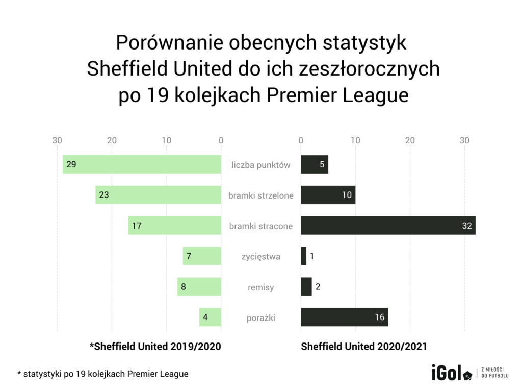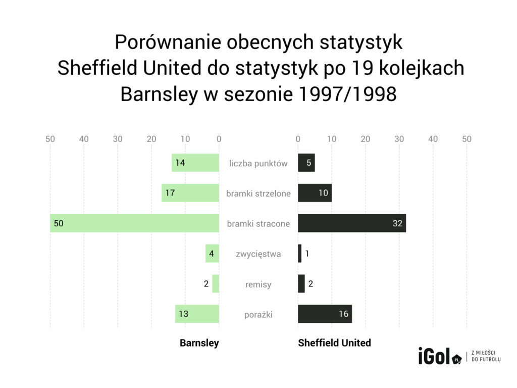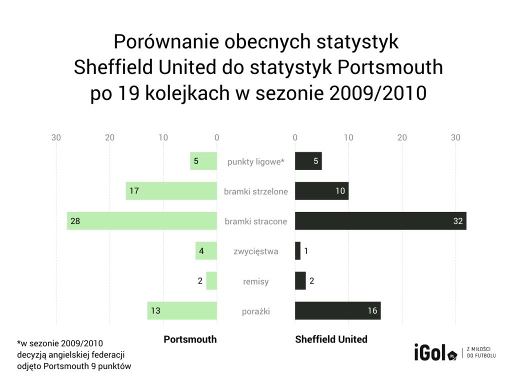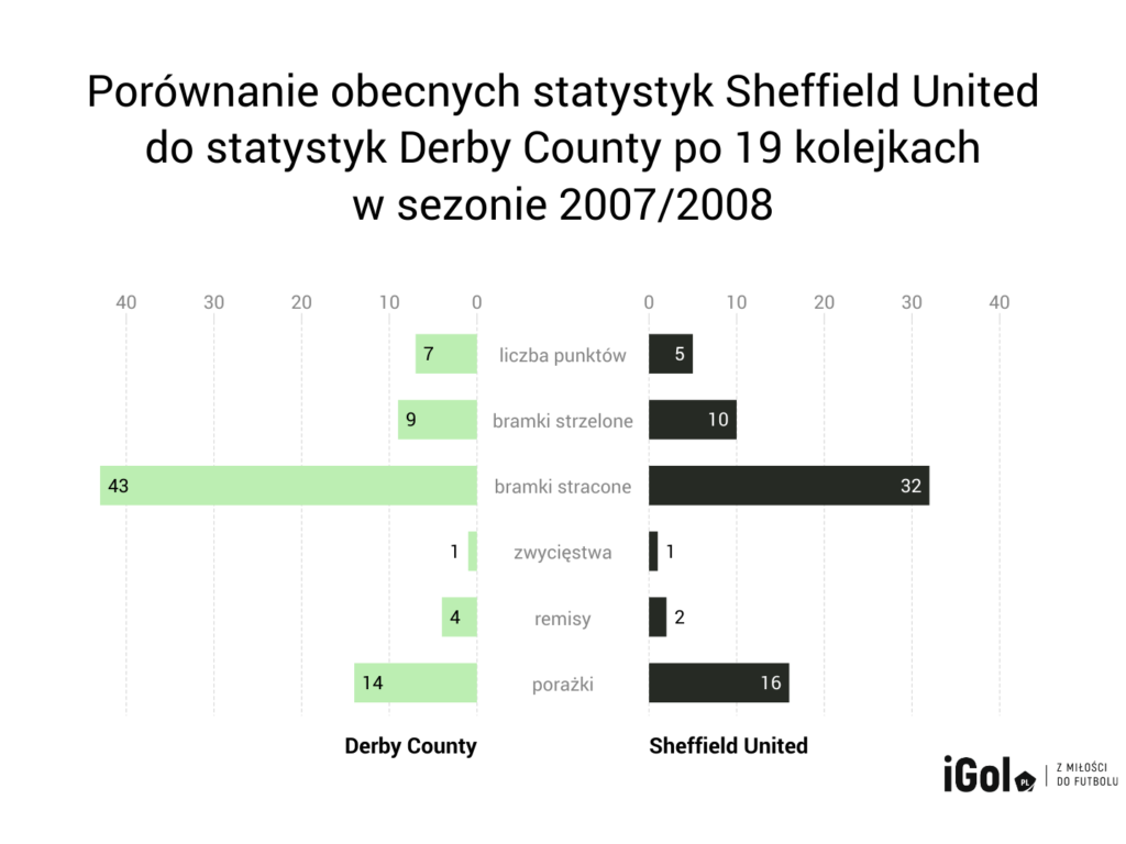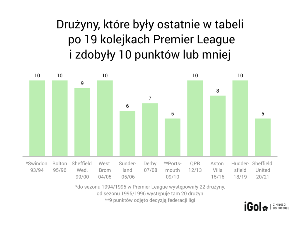 Jeżeli chodzi o drużyny, które na półmetku rozgrywek miały dziesięć punktów lub mniej i były ostatnie w lidze, to sytuacja również nie przedstawia się dobrze dla Sheffield United. Prawie każdy z tych zespołów musiał po tak słabym sezonie pożegnać się z najwyższą klasą rozgrywkową w Anglii. Wyjątkiem było West Bromwich Albion w sezonie 2004/2005, które uratował wtedy przed degradacją Bryan Robson. Rzeczywistość dla „Szabli” nie jest więc dobra, ponieważ z dziesięciu klubów w takiej lub nieco lepszej sytuacji tylko jeden zdołał się utrzymać.