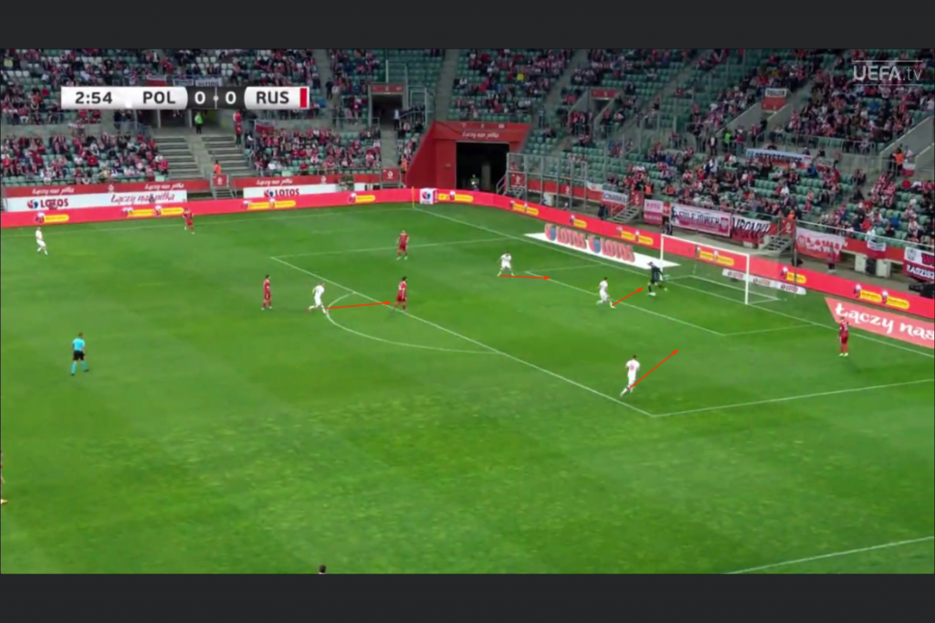 Pomimo tego, że na mecz z Rosją wyszliśmy rezerwowym składem, to i tak jest to cenna lekcja dla nas, kibiców. W tej konkretnej sytuacji widać, ile miejsca zostawili zawodnikowi w czerwonej koszulce nasi piłkarze. Warto dodać, że jest to akcja, po której nasz zespół stracił bramkę. Na początku Frankowski trochę na tzw. radar pilnował Golovina – był od niego za daleko, a następnie Puchacz przez swoje fatalne ustawienie przegrał pojedynek z zawodnikiem rosyjskim.