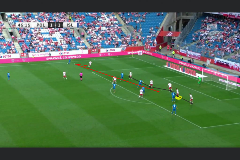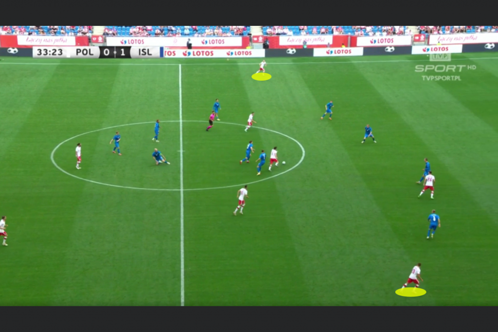 Jeśli mielibyśmy wskazać największy mankament drużyny prowadzonej przez Paulo Sousę, to zdecydowanie byłaby to obrona. Zachowania naszych defensorów od wielu spotkań odbiegają od chociażby tych z Euro 2016, podczas którego królował m.in. Michał Pazdan. Dziś takiego zawodnika nie ma, obrona zachowuje się ślamazarnie i momentami nieporadnie. Pokazuje to np. ta sytuacja z meczu z Islandią, w której z teoretycznie niegroźnej akcji padła bramka dla naszych rywali. Rzut wolny na 40. metrze od bramki, podanie do bocznej strefy boiska, dośrodkowanie i gol. Tak Islandia zaskoczyła naszych piłkarzy i tak zaskakiwały inne drużyny. Na wyżej załączonym obrazku widać, że tuż przed dośrodkowaniem Grzegorz Krychowiak jest dość daleko od swojego przeciwnika, a to oznacza, że trudniej mu będzie zaliczyć udaną interwencję. Na uwagę w tej sytuacji zasługuje również stosunkowo mocno połamana linia obrony „Biało-czerwonych”. Pomiędzy pierwszym a drugim obrońcą jest za duża odległość, a z kolei trzeci łamie linię spalonego.