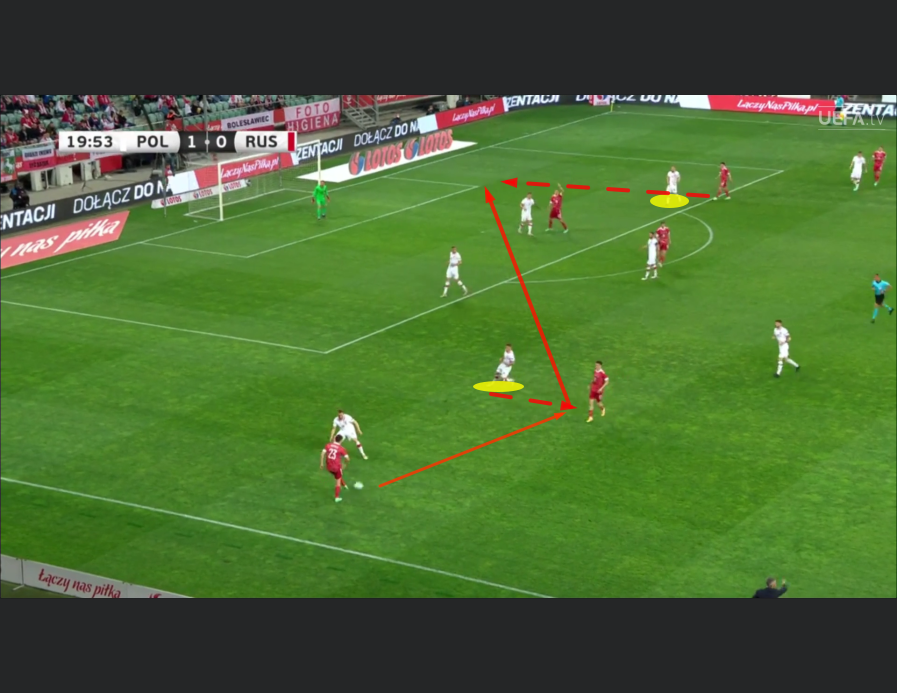 Tym, co jest charakterystyczne dla naszej reprezentacji, odkąd prowadzi ją portugalski selekcjoner, jest to, że „Biało-Czerwoni” starają się podchodzić wysoko do rywali. Szczególnie w pierwszych fazach meczu jest to dość wyraźnie widoczne. Oczywiście nie da się tak grać cały mecz, ale dłuższymi bądź też krótszymi fragmentami Polacy pressują obronę czy też bramkarza przeciwników. A to przynosi efekty. Doskonałym przykładem jest niedawny mecz z Rosją, w którym wysoki pressing skutkował niedokładnym rozegraniem naszych rywali, przechwytem, a następnie golem Świerczoka. Na wyżej załączonym obrazku bardzo dobrze widać, jak odważnie i agresywnie na gości podeszli nasi piłkarze. Zawodnicy w białych strojach umiejętnie odcięli bramkarzowi możliwość rozegrania.