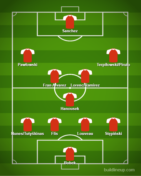 Natomiast drugi pomocnik będzie zależeć od tego, czy do zdrowia wrócił Pirulo. Jeśli będzie on dostępny na nadchodzące spotkanie, to do środka pola, czyli tam, gdzie jego miejsce, wróci Dani Ramirez. Jakości tego piłkarza nie musimy chyba nikomu zbytnio uzasadniać. A jeśli nie dojdzie do zdrowia Pirulo, to pozostaje Michał Mokrzycki, który spokojnie może grać również na „ósemce”. Wtedy na pozycji defensywnego pomocnika zagrałby Mieszko Lorenc, który z meczu na mecz prezentuje się coraz lepiej. A z pewnością lepiej niż Dominik Kun czy Filip Przybułek. Pozostaje również Engjell Hoti, który mimo pewnych problemów notuje najwięcej odbiorów z zawodników ŁKS-u. 4,5 do 3,5 dla beniaminka, zatem punkt różnicy pozostał.