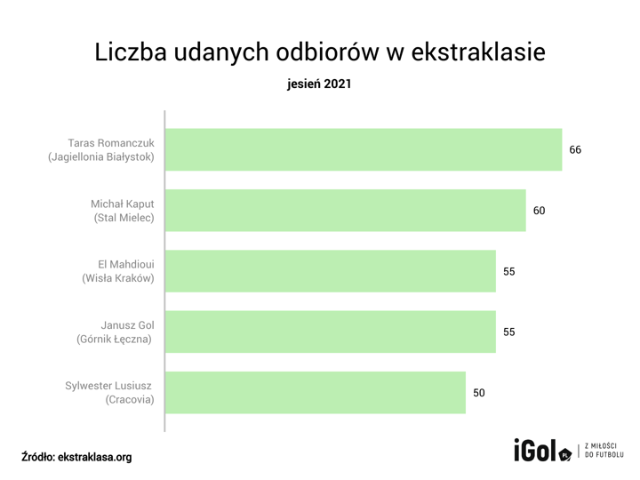 To właśnie Taras Romanczuk ma najwięcej udanych odbiorów. A przeliczając tę statystykę na rozegrane mecze, piłkarz Jagiellonii oraz Michał Kaput zajmują ex aequo 1. miejsce. Obaj zawodnicy mają średnio cztery skuteczne przechwyty w ciągu 90 minut.