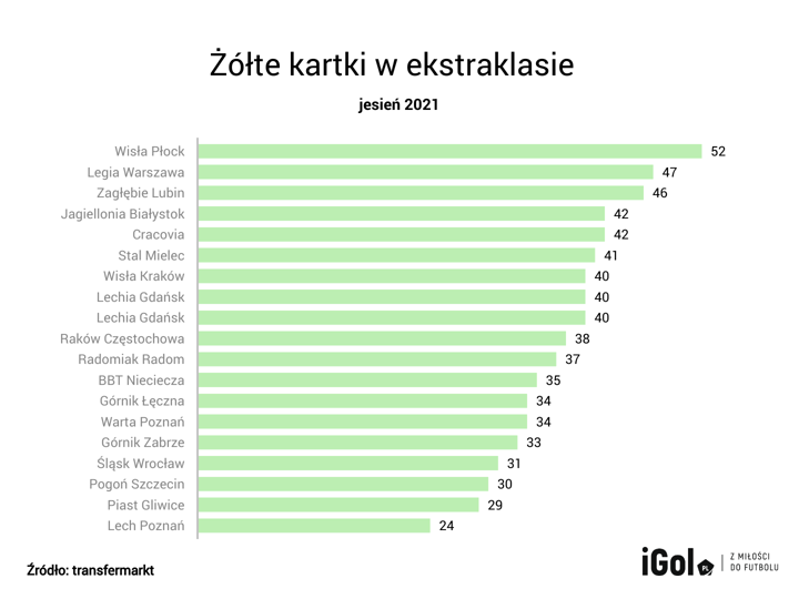 Najwięcej żółtych kartek obejrzeli gracze Wisły Płock – 52. Tuż za nimi jest Legia Warszawa – 47, a podium zamyka Zagłębie Lubin z 46 „żółtkami”. Z kolei najmniej piłkarze Lecha Poznań, Piasta Gliwice i Pogoni Szczecin. Kolejno 24, 29 i 30 żółtych kartoników. Poniżej cała tabela.