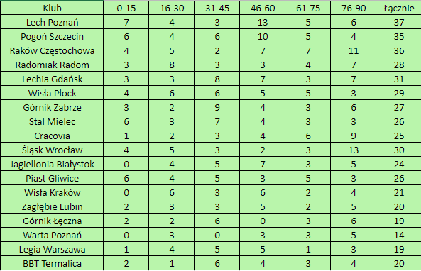 Przygotowaliśmy również zestawienie, które przedstawia zdobyte bramki z podziałem na kwadranse. Całość prezentuje się następująco.