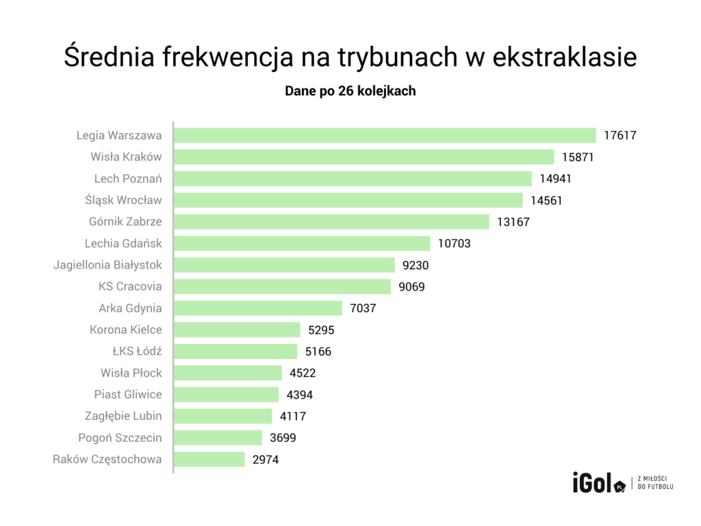 Załóżmy taki wariant mocno optymistyczny. Sytuacja pandemii w Polsce uspokoi się na tyle, że będzie można wrócić do gry. Ale rozgrywki jeszcze będą kontynuowane bez publiczności. Wydaje nam się, że pewnie każdy z Was domyśla się, które kluby mogą najbardziej ucierpieć przez puste trybuny. Oczywiście te z największą frekwencją na trybunach i można byłoby stawiać z góry, że chodzi o Legię, Lecha czy Lechię. Aby to najlepiej zobrazować, przeanalizowaliśmy wszystkie mecze tego sezonu PKO Ekstraklasy i sprawdziliśmy, jak wypada średnia frekwencja na trybunach w polskiej lidze.