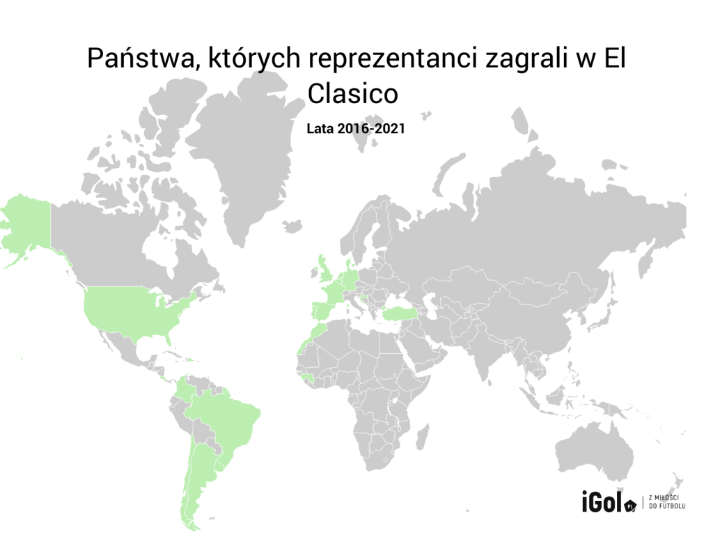 Teraz czas na odrobinę geografii. Jak mawia pewien klasyk, „Panie, ja kończyłem podstawówkę, a nie geografię”. Ale w zupełności nie przeszkodziło nam to w stworzeniu tej mapy. Przed państwem mapa z zaznaczonymi państwami, z których pochodzą zawodnicy, którzy wystąpili w El Clasico. UWAGA! Pod uwagę bierzemy ostatnie pięć lat, a więc od meczu FC Barcelona – Real Madryt, który odbył się 2 kwietnia 2016 roku.