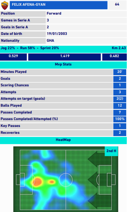 Do momentu wejścia na boisko Afeny-Gyana Roma oddała tylko dwa celne strzały. Po jednym Eldora Shomurodova i Lorenzo Pellegriniego. Sam Felix dwa razy uderzył w światło bramki, właśnie te próby zakończyły się bramkami. Biorąc pod uwagę, że 18-latek miał raptem 12 kontaktów z piłką (wykonał siedem podań i miał 100% skuteczność), to zaliczył prawdziwe wejście smoka.