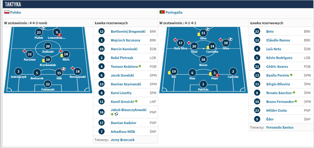 Po dobrym początku „Biało-czerwonych” Portugalczycy wykorzystali rzut rożny. Po dośrodkowaniu Renato Sanchesa gola zdobył Andre Silva. Był to zaskakująco dobry mecz Polaków. W poprzeczkę uderzał Kędziora, szanse mieli Milik, Frankowski, Zieliński. Po nieco ponad godzinie gry Arkadiusz Milik przewrócił się w polu karnym po odbiorze Danilo Pereiry. Sędzia Sergey Karasev podyktował rzut karny i wyrzucił Portugalczyka z boiska. Kto wie, czy werdykt zostałby podtrzymany, gdyby w tamtym spotkaniu był VAR.