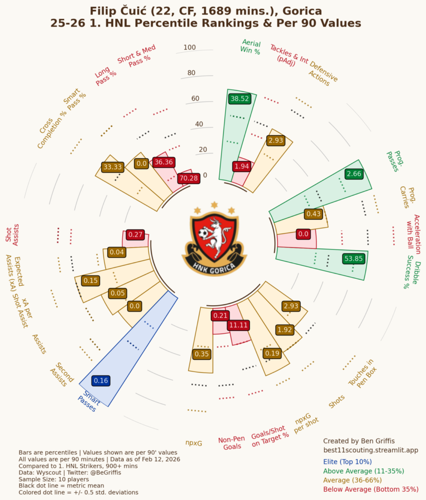 Należy stwierdzić na wstępie, że sezon 2025/2026 jest jego najlepszym w seniorskiej karierze. Filip Cuić miał pewny plac w HNK Gorica, no i zdobył najwięcej goli dla swojego zespołu. – Cuić jest rosły, mierzy 188 cm wzrostu, bardzo dobrze gra głową. Ma też bardzo dobre przyspieszenie, kilka razy w tym sezonie zanotowano mu prędkość 35,8 km/h – informował Piotr Koźmiński. Młody, wysoki, szybki. Gdzie zatem wady?