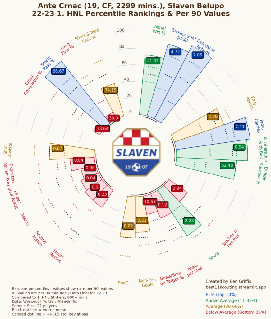 Idźmy zatem dalej. Spójrzcie na grafikę przedstawiającą najważniejsze statystyki zebrane przez Bena Griffisa na stronie https://best11scouting.streamlit.app/. W zdecydowanej większości statystyk Chorwat o bośniackich korzeniach niczym nie wyróżniał się od reszty zawodników w lidze. Cechuje go za to z pewnością dobra gra w powietrzu oraz skuteczny drybling.