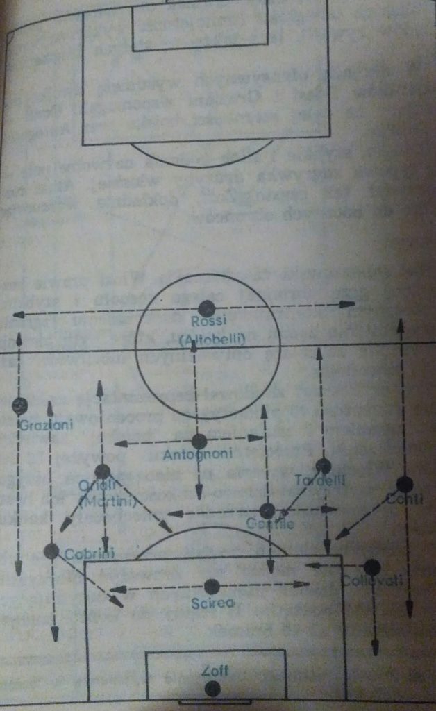 Włosi w starciu z Brazylią głównie postawili na defensywne rozwiązania. Boczni zawodnicy nie decydowali się na grę na całej szerokości boiska. Dominowały krótkie zagrania i umiejętne przesuwanie w defensywie. Mecz z Brazylią zakończył się wynikiem 3:1 dla piłkarzy Enzo Bearzota, a Paolo Rossi popisał się hattrickiem. Włochy przebudziły się i awansowały do półfinału, gdzie zmierzyli się z Polską.