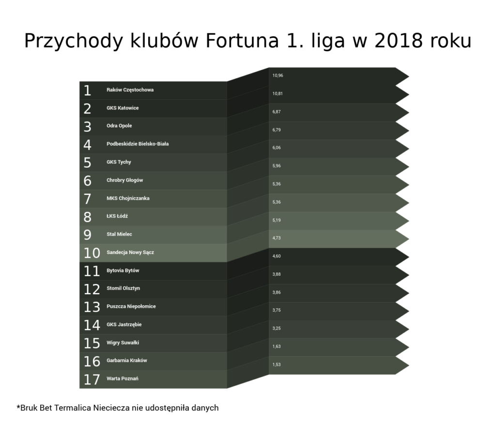 Najnowszy raport dotyczy sezonu 2018/2019, a konkretniej roku kalendarzowego 2018, w którym wzięto na tapet wszystkie kluby występujące na drugim poziomie rozgrywkowym. Jak wypadła ich kondycja finansowa? Cóż, patrząc w niedaleką przeszłość i biorąc pod uwagę kwoty zebrane przez całą ligę, nie ma powodów do optymizmu. Przychody (bez uwzględnienia transferów) spadły bowiem o 15% i wyniosły 90,6 mln złotych (rok wcześniej – 106,6 mln). Kto zarobił najwięcej? Raków Częstochowa i GKS Katowice z przychodami rzędu prawie 11 milionów złotych.