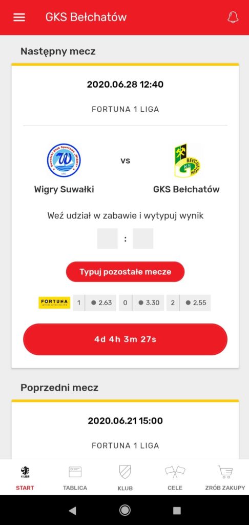 Na sam początek wita nas strona startowa, zaprojektowana bardzo estetycznie (zresztą podobnie jak cała aplikacja). To nasza „baza” – stąd mamy dostęp do najświeższych wiadomości na temat naszego klubu (bądź całej ligi). Wiemy także, kiedy i z kim nasz zespół rozegra następny mecz oraz jak wypadł w poprzednim starciu. W końcu mamy także wgląd w tabelę Fortuna 1. Ligi z wyszczególnieniem naszego zespołu. W trakcie meczu zaś możemy śledzić poczynania naszego zespołu. Mowa nie tylko o wyniku, lecz także o dokładnych statystykach i wizualizacji przebiegu spotkania, który dostarczany jest przez firmę StatScore.