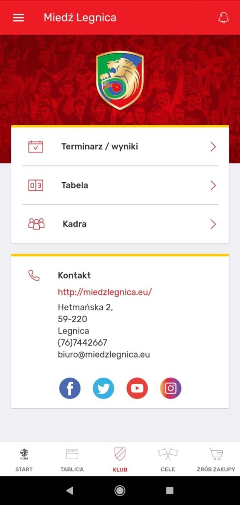 Bardzo szybko możemy także sprawdzić najważniejsze dane naszego klubu. W zakładce „klub” w ekspresowym tempie możemy przejść na klubową stronę, sprawdzić adres mailowy czy telefon do klubu. Znajdziemy tutaj także linki do profili w mediach społecznościowych. Za przykład weźmy Miedź Legnica. Jak widać, z profilu klubu możemy trafić na Facebooka, Twittera, Instagram, a także kanał Miedzi na portalu YouTube.