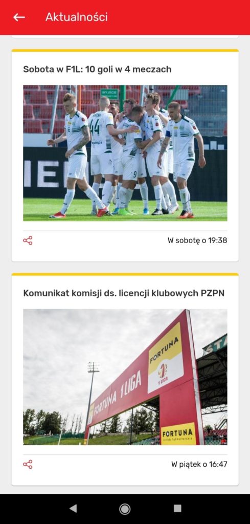 To tyle, jeżeli chodzi o stronę startową, pozostałymi, bardziej złożonymi funkcjami zajmiemy się później. Przechodzimy do zakładki aktualności. Tutaj – przynajmniej w teorii – pojawiać się mają najważniejsze doniesienia na temat naszego ulubionego zespołu, a także całej ligi. Jak wygląda to w praktyce? Znaleźć możemy tutaj niemalże wszystko, co trafia na oficjalną stronę internetową Fortuna 1. Ligi.