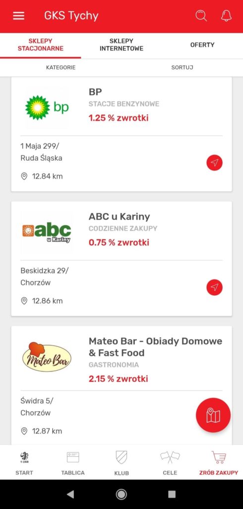 To zdecydowanie jedna z najważniejszych funkcji. Robiąc zakupy z aplikacją Fortuna 1. Ligi, można w znaczący sposób wspomóc swój klub. Każdy klub posiada swoją własną siatkę sklepów partnerskich – od punktów, w których zakupy robimy codziennie, do stacji benzynowych czy nawet warsztatów motoryzacyjnych. Zazwyczaj sklepy oferują niewielki procent zwrotu dla klubu – od 1 do 1,5%. Niektórzy oferują jednak nieco więcej. Jeden z warsztatów motoryzacyjnych zrzeszony z GKS-em Tychy proponuje aż 10% zwrotki.