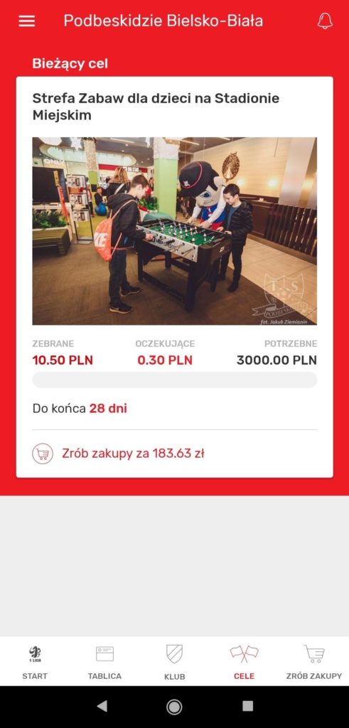 No właśnie. „Cele” to kolejna niezwykle ważna funkcja, bezpośrednio połączona z systemem zakupowym. Każdy klub może utworzyć zbiórkę pieniędzy na dowolny cel. Niektóre zespoły już skorzystały z tej funkcji i zbierają pierwsze środki. Dla przykładu: Podbeskidzie Bielsko-Biała zbiera obecnie pieniądze na wyposażenie specjalnej strefy zabaw dla dzieci. Według opisu to tam w trakcie meczu najmłodsi kibice będą mogli spędzić czas wraz z animatorem.