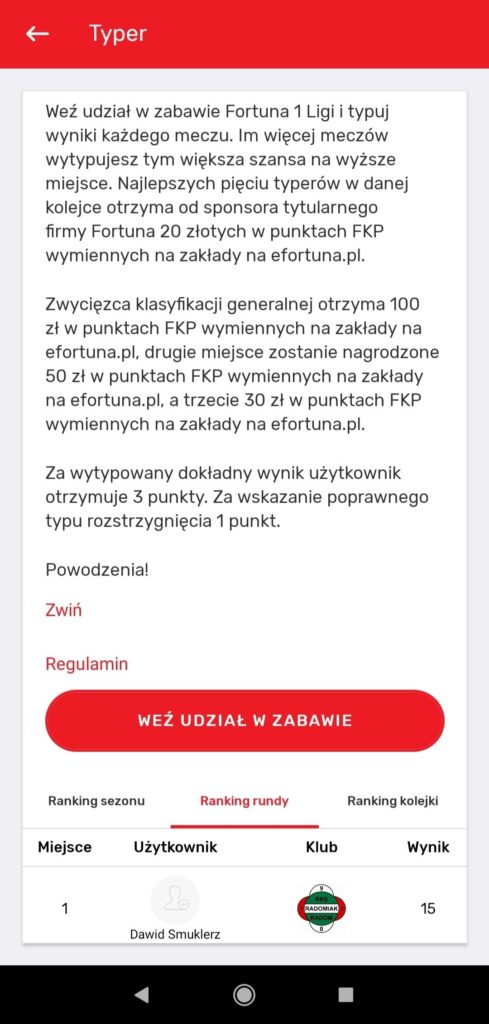 Aplikacja Fortuna 1. Ligi pozwala kibicom wziąć udział w specjalnie przygotowanej zabawie. Przed każdą kolejką użytkownicy mogą spróbować wytypować dokładny wynik wszystkich spotkań danej serii gier. Tym, którzy idealnie wytypują wynik spotkania, przyznawane są trzy punkty. W przypadku poprawnego wskazania zwycięzcy (bądź też wytypowanie remisu) gracz uzyskuje jeden punkt. Klasyczny typer.