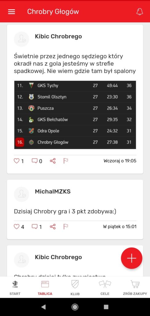 Każdy wpis na tablicy można również „polubić” w formie podobnej do tablicy Twittera, a także skomentować. Udostępnianie ciekawych treści to także bardzo szybki proces. Tablice to bardzo dobry sposób na tworzenie kibicowskiej społeczności w naszych kieszeniach. Korzystać z tej funkcji zaczęli już między innymi fani Chrobrego Głogów. Cóż… Słów krytyki nie zabrakło.