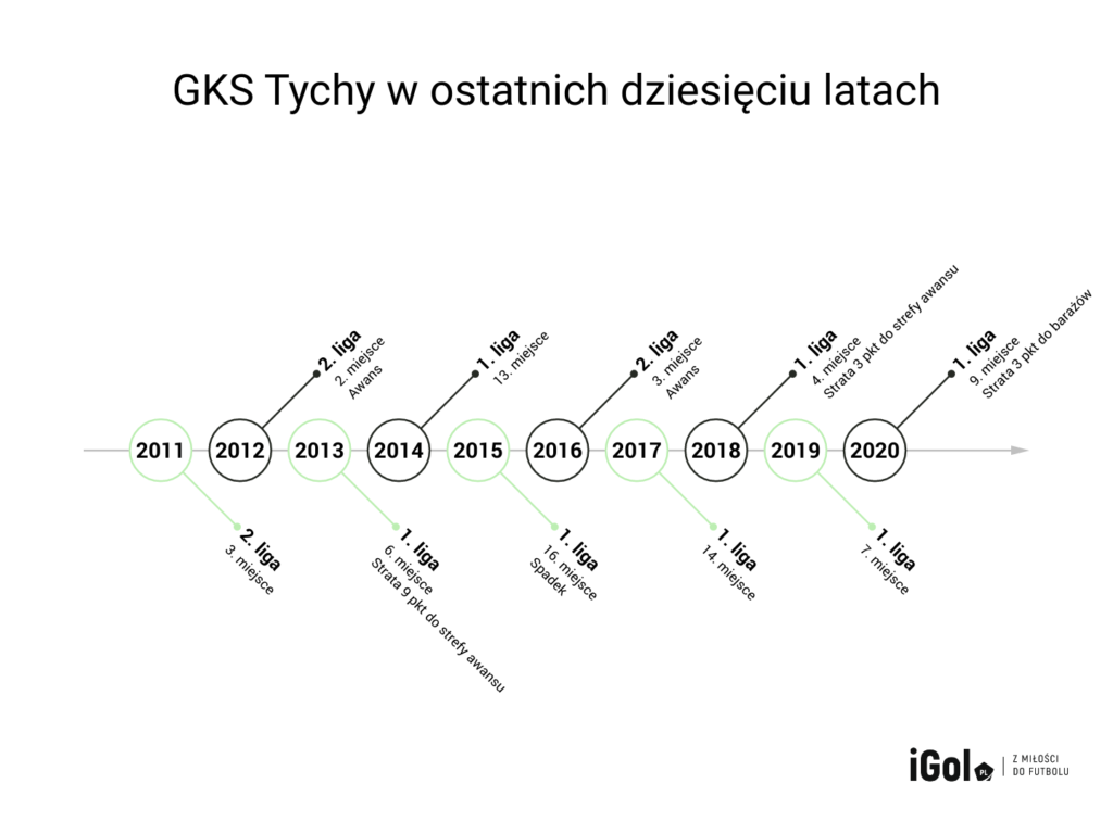 Wspominaliśmy na samym początku rok rozpoczęcia budowy nowego obiektu w Tychach. Stadion, który może pomieścić ponad 15 tysięcy kibiców. Już był areną kilku ważnych turniejów, jak choćby mistrzostw Europy do lat 21 w 2017 roku (rozegrano na nim trzy mecze fazy grupowej i jeden półfinał) i mistrzostw świata do lat 20 w 2019 roku (rozegrano na nim sześć meczów fazy grupowej, jedno spotkanie 1/8 finału i jeden ćwierćfinał). Gościła na nim także młodzieżowa reprezentacja Polski. Lokalni kibice mieli już okazję oglądać w swoim mieście ważne spotkania, ale chcieliby wreszcie móc zobaczyć GKS Tychy w ekstraklasie. Niestety w ostatnich latach było nie po drodze z szansami na awans. Tutaj musimy się cofnąć jeszcze dalej.