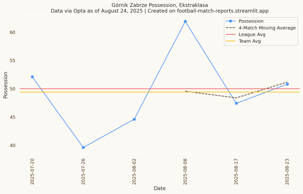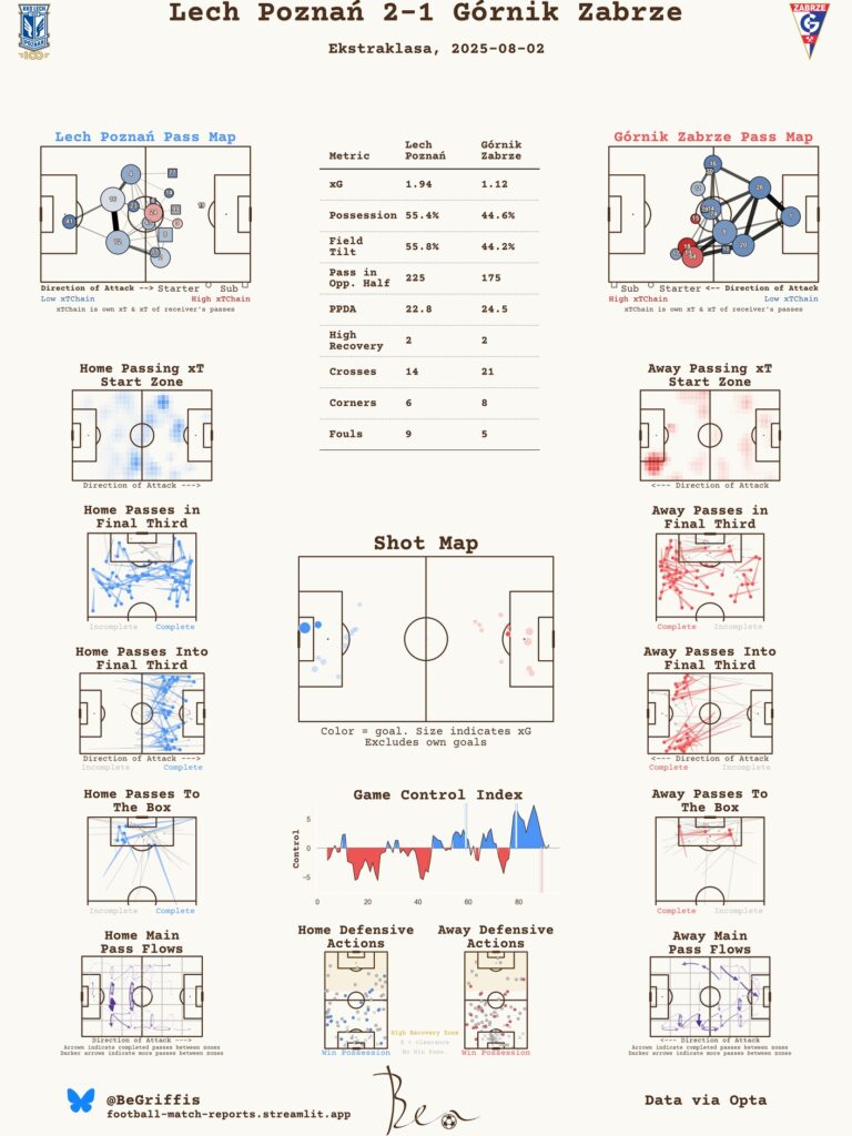 Sam przebieg meczu miał swoją dramaturgię. Wykres kontroli pokazuje, że Lech prowadził grę od samego początku, ale w kilku momentach Górnik próbował się odgryzać. Zwłaszcza w drugiej połowie, gdy musiał gonić wynik, miał swoje fragmenty z piłką, lecz nie potrafił przekuć tego na klarowne okazje. Lech natomiast nie grał huraganowo, tylko spokojnie, konsekwentnie, jak zespół, który ma świadomość własnej przewagi i nie potrzebuje nerwowych ruchów. Atmosfera na stadionie dopełniała obrazu. Kibice Lecha czuli, że ich drużyna ma ten mecz pod kontrolą, więc doping był bardziej pewnym wsparciem niż nerwowym wołaniem o ratunek. Widać było zaufanie trybun do zespołu. Górnik, choć miał swoje chwile, nie potrafił narzucić rytmu ani na boisku, ani poza nim.