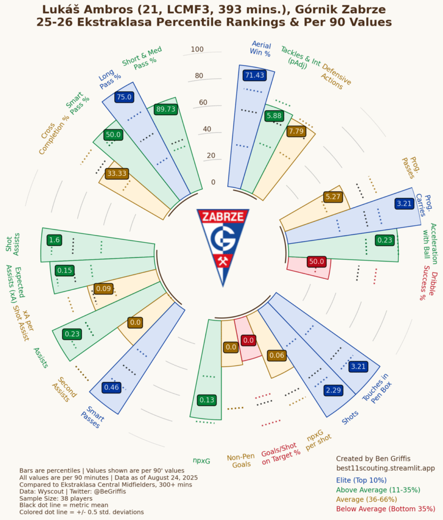 Lukas Ambros to zawodnik, który po 393 minutach w barwach Górnika Zabrze daje się poznać jako środkowy pomocnik o bardzo wyraźnym profilu. Ma 21 lat i choć statystyki nie pokazują jeszcze bezpośredniego wpływu na gole, jego rola na boisku jest jasna i wartościowa – to piłkarz, który kontroluje posiadanie, porządkuje rozegranie i nadaje drużynie rytm.