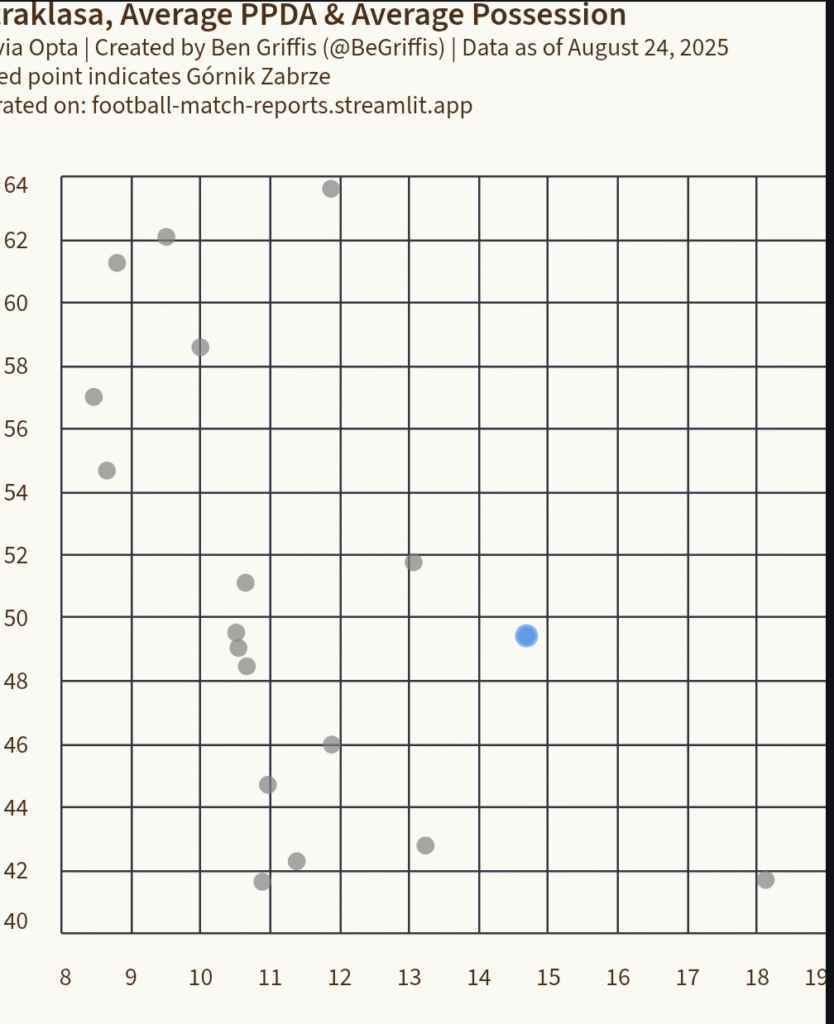 GKS potrafił parę razy założyć pressing. Sześć razy odebrał piłkę wysoko, podczas gdy Górnik tylko dwa. Problem w tym, że na tym się kończyło. Po przechwycie brakowało dokładności, piłka była tracona zbyt szybko i z przewagi nic nie wynikało. To pokazuje różnicę w organizacji. Obie drużyny miały podobne PPDA, więc intensywność pressingu była zbliżona, ale Górnik robił to z głową – czekał, utrzymywał strukturę i nie pozwalał przeciwnikowi łatwo wejść w pole karne. Katowice próbowały agresywniej i przez to częściej zostawiały dziury i miejsce do kontrataków.