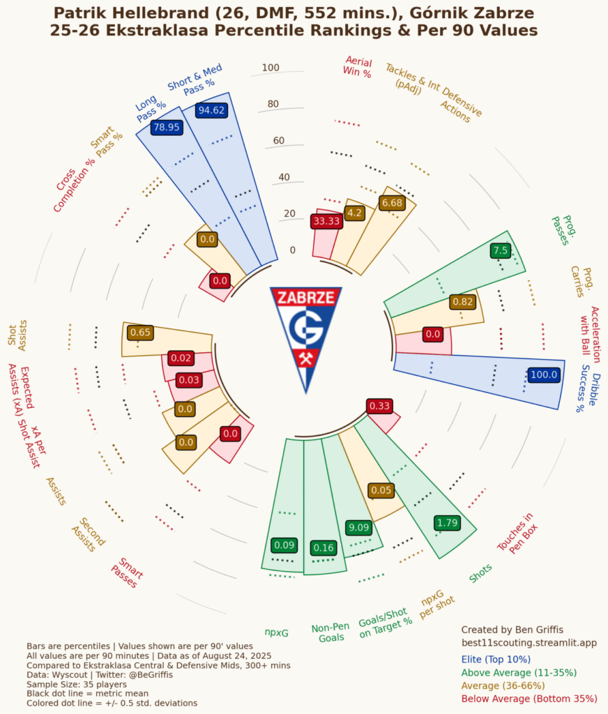 Patrik Hellebrand to profil bardzo nietypowy jak na defensywnego pomocnika. Jego liczby pokazują wyraźnie, że największą wartość daje w rozegraniu, a nie w klasycznym odbiorze piłki. Blisko 95% skuteczności podań krótkich i średnich, do tego prawie 80% przy dłuższych zagraniach – to wyniki z absolutnej czołówki ligi. Widać, że Hellebrand świetnie nadaje rytm grze i nie boi się odpowiedzialności w budowaniu ataku.