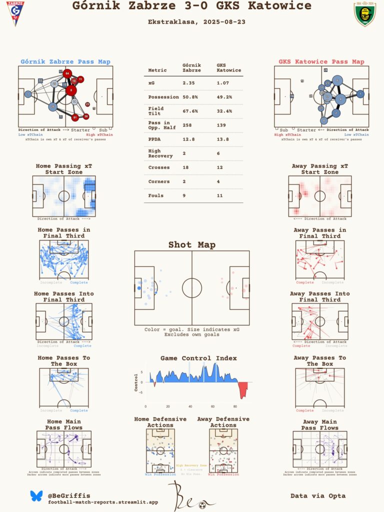 Przebieg meczu najlepiej obrazuje wykres kontroli. Od 20. do 70. minuty Górnik dyktował tempo i właśnie wtedy padły gole. Przy 0:3 Katowice ruszyły odważniej, ale wtedy było już za późno. To klasyczny scenariusz: drużyna przegrywa wysoko, więc rzuca wszystko do przodu, ale wynik jest już poza zasięgiem. Stałe fragmenty też mogły być dla gości ratunkiem. Mieli więcej rzutów rożnych, ale nic z tego nie wynikało. Górnik dobrze się ustawiał, nie pozwalał na czyste strzały i w ten sposób odbierał GKS-owi kolejną szansę na złapanie kontaktu. W faulach panowała równowaga, to nie był brutalny mecz, raczej standardowe przerywanie akcji.