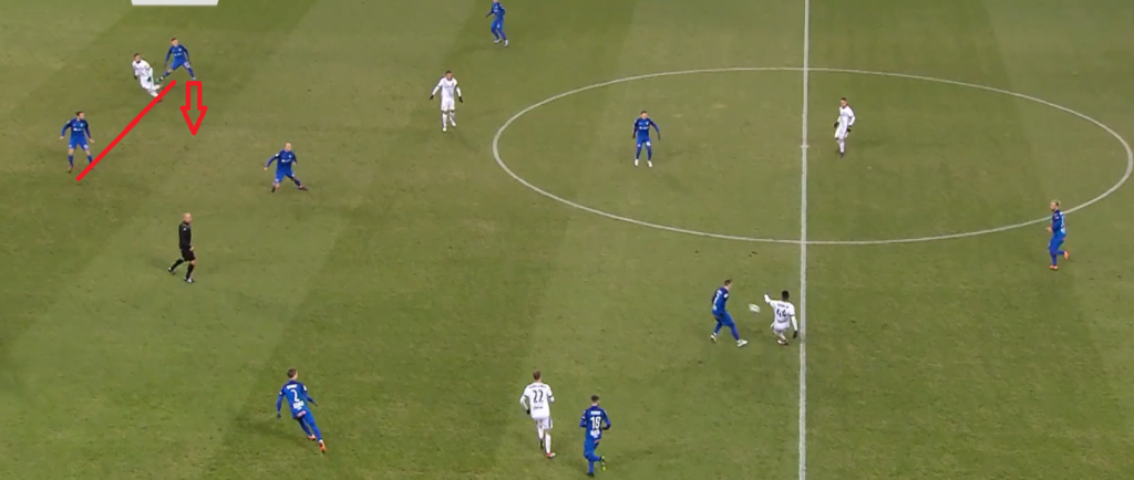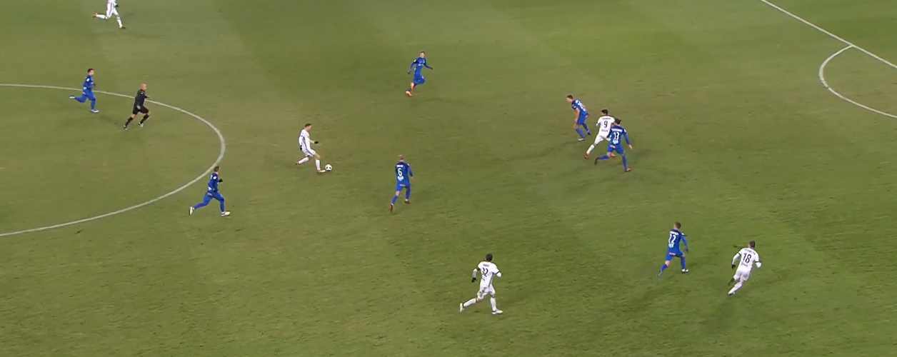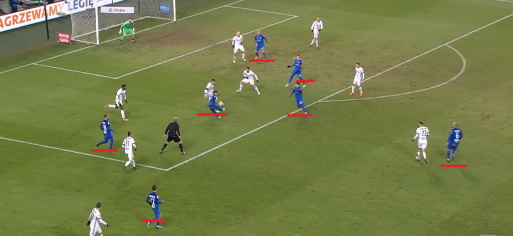 Do obrony nie zdążył wrócić Kucharczyk, zaś cała akcja Lecha rozpoczęła się od straty Eduardo. Na grafice widzimy, że napastnik gości jest teoretycznie kryty przez dwóch defensorów Legii. Po chwili obaj stracą jednak kontrolę nad Gytkjaerem.