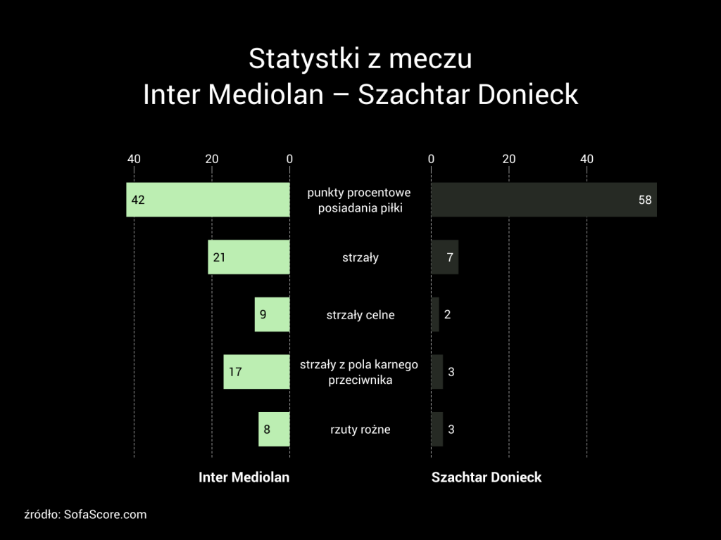 Inter postawił ją dopiero w drugiej części meczu, w której grał skromniej niż w pierwszej, ale o wiele skuteczniej. Na poniższej grafice możemy zaobserwować, jak wyglądały statystyki na sam koniec konfrontacji.