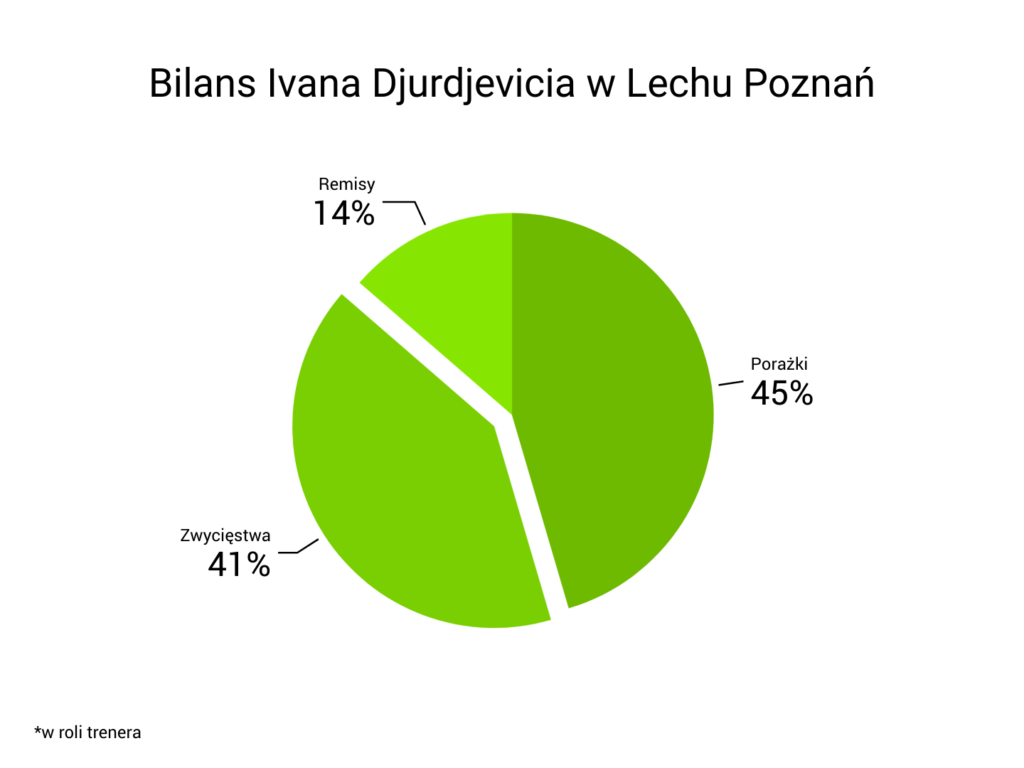 43-letni szkoleniowiec został odprawiony z Poznania w listopadzie 2018 roku. Bilans? Wiadomo, gdyby był lepszy, to Djurdjević być może wciąż zasiadałby na ławce trenerskiej w dresie Lecha Poznań. Popularny „Djuka” prowadził zespół „Kolejorza” w 22 spotkaniach. Przełożyło się to na dziewięć zwycięstw, trzy remisy i dziesięć porażek. Procentowo wygląda to natomiast w ten sposób: