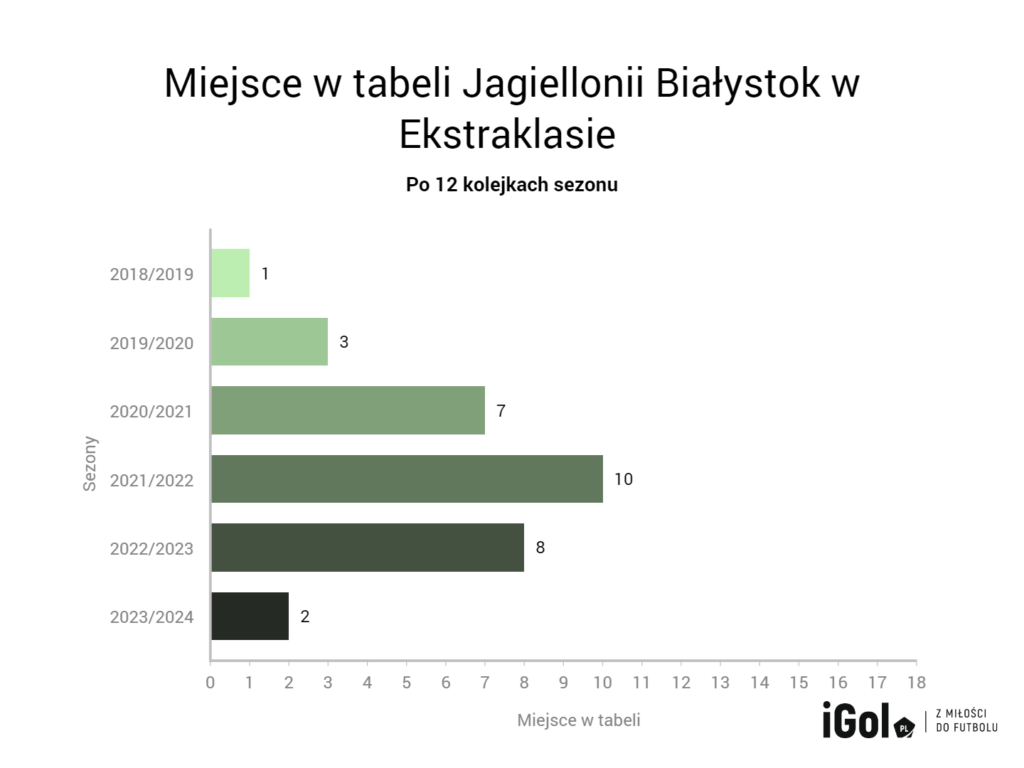 Na Podlasiu mogli już zapomnieć o czasach, gdy Jagiellonia Białystok była tak wysoko i tak świetnie punktowała. Ostatni raz miało to miejsce w sezonie 2018/2019, za czasów Ireneusza Mamrota. Po dwunastu kolejkach przewodziła w tabeli i miała o punkt więcej niż teraz. „Duma Podlasia” jest na fali wznoszącej i jesteśmy ciekawi, na ile starczy jej sił.