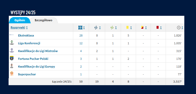 Łatwo policzyć, że sezon ligowy w PKO BP Ekstraklasie to 3060 minut – 34 kolejki po 90 minut każda. Po doliczeniu pięciu spotkań Pucharu Polski, czyli tyle, ile rozegrała zdobywczyni tego pucharu – Legia Warszawa, wychodzi łącznie 3510. To nadal mniej niż liczba minut, którą rozegrali w tym sezonie Abramowicz, Imaz, Moutinho, Pululu czy Skrzypczak. Do końca sezonu zostały jeszcze trzy kolejki, więc dorobek tych piłkarzy jeszcze na pewno się zwiększy.