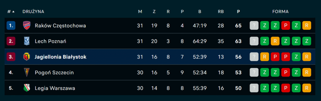 Do końca sezonu terminarz Jagiellonii wygląda następująco: Raków (W), Śląsk (W) oraz Pogoń (D). Nie jest to wymarzona końcówka sezonu, ale jeśli w Białymstoku marzą o europejskiej przygodzie w następnym sezonie, muszą w tych trzech spotkaniach zrobić komplet punktów. Ostatni mecz z Pogonią będzie o tyle ważny, że „Portowcy” to aktualnie najpoważniejszy rywal o 3. miejsce w lidze. Obecnie drużyna trenera Kolendowicza traci do białostoczan trzy punkty oraz w środę rozegra mecz zaległy. W przypadku takiej samej liczby oczek o miejscu w tabeli zadecyduje bilans meczów bezpośrednich. W pierwszym pojedynku tych obu ekip padł remis 1:1.