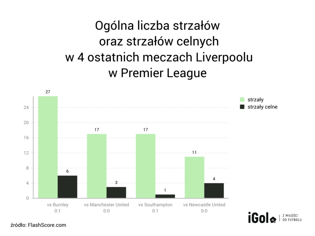 O ile w zeszłych sezonach zespół niemieckiego szkoleniowca błyszczał skutecznością, śrubując niesamowite rekordy, tak w obecnym miesiącu gra fatalnie w ataku. Jeżeli problemem jest strzelenie bramki w meczach z Burnley czy Newcastle United, to widać, że w klubie zaszły spore komplikacje. Jeżeli chodzi o samą grę, piłkarze ofensywni w poszczególnych spotkaniach nie wypadają źle. W meczu z Burnley z pewnością na pochwałę zasługiwała gra Sadio Mane, natomiast w konfrontacji z Manchesterem United wyróżnił się chociażby Roberto Firmino. Jednak największe kłopoty pojawiają się, gdy trzeba podjąć kluczową decyzję, która znajdzie swe skutki w postaci gola.