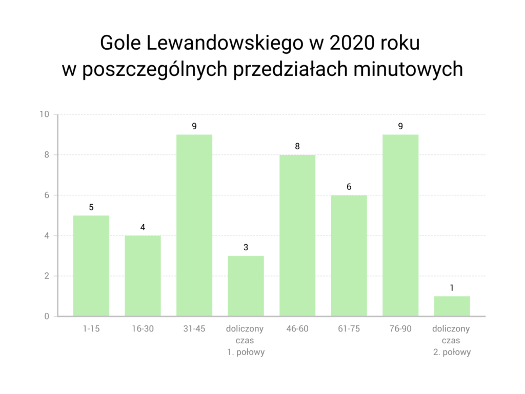 Z 45 strzelonych goli Lewandowskiego w 2020 roku 21 padło w pierwszych połowach spotkania, a 24 w drugich. Procentowo bilans zbliżony do tego z zeszłego roku. W tym, podobnie jak w zeszłym, Polak upodobał sobie przede wszystkim strzelanie w końcówkach połów. W ostatnich kwadransach strzelał po dziewięć razy. Wliczając doliczony czas gry, łącznie 22 trafienia w końcówkach, co stanowi połowę jego wszystkich trafień. Gdy większość piłkarzy gra na oparach, on wchodzi na jeszcze wyższy poziom. Maszyna.